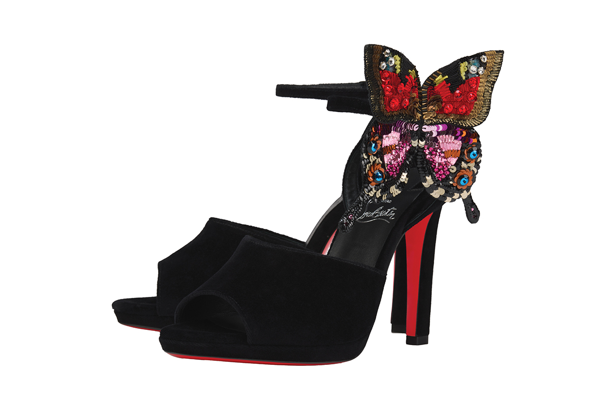 The crystalline butterfly perched atop these sandals’ ankles is sure to draw the eye with its vibrant hues against the classic black velvet. With a slim heel that makes way for a peek of the iconic Loubi red, this pair is ideal for anyone looking to steal the show with each step.
