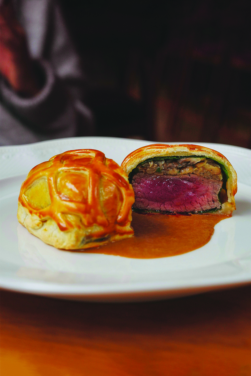 Rooted in English culinary history, this dish features tender wagyu beef fillet layered with mushroom duxelles and encased in pastry. The rich marbling of the wagyu keeps the meat succulent, while the golden puff pastry provides a flaky contrast. Once sliced, it reveals a delicious combination of flaky crust, earthy mushrooms and buttery beef. Often served with red wine jus or Madeira sauce, this menu embodies sophistication and indulgence.