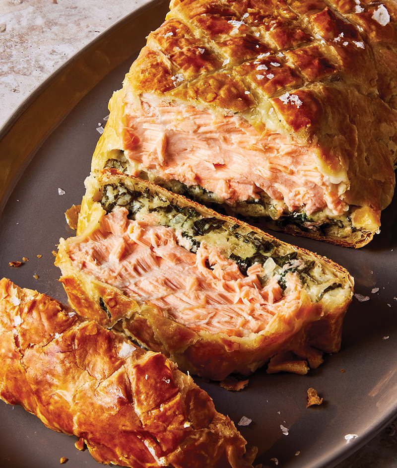 The French name translates to salmon wrapped in pastry. This dish offers a lighter yet impressive festive option: a fillet of salmon encased in puff pastry, often layered with spinach, herbs or cream cheese. The salmon is baked until the pastry turns golden and the fish remains moist. It is typically served with lemon-dill or beurre blanc sauce, balancing richness with freshness. When sliced, the dish reveals delicate layers that are visually appealing and delightful on the palate.