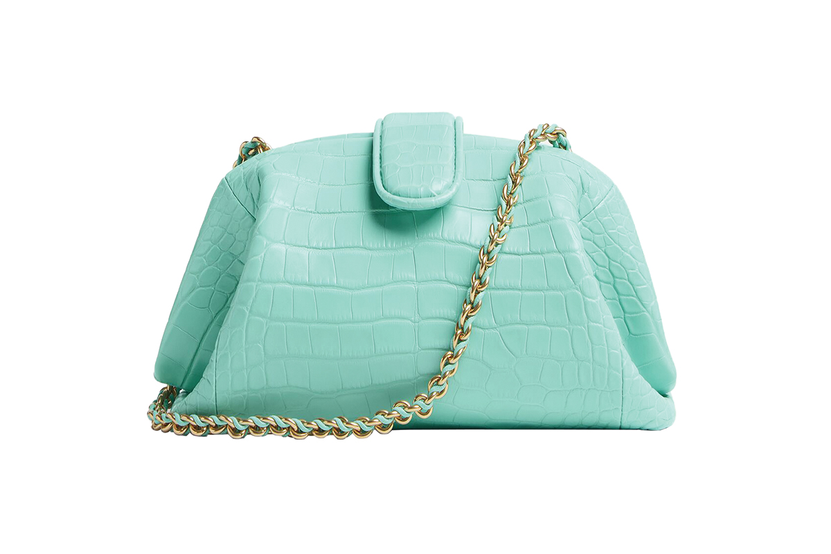 This Green Oasis alligator clutch transitions from day to night with a sumptuous lambskin lining and a signature leather-braided metal chain for ultimate prestige, allowing it to dazzle as a statement piece while keeping a timeless silhouette.