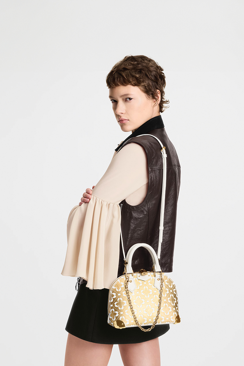 Debuted at the Cruise 2026 runway, this handbag makes French decorative arts compact, lightweight, and portable. Floral motifs that evoke the maison’s hallmark monogrammed patterns and golden chain and padlock embellishments lend an air of opulent playfulness.