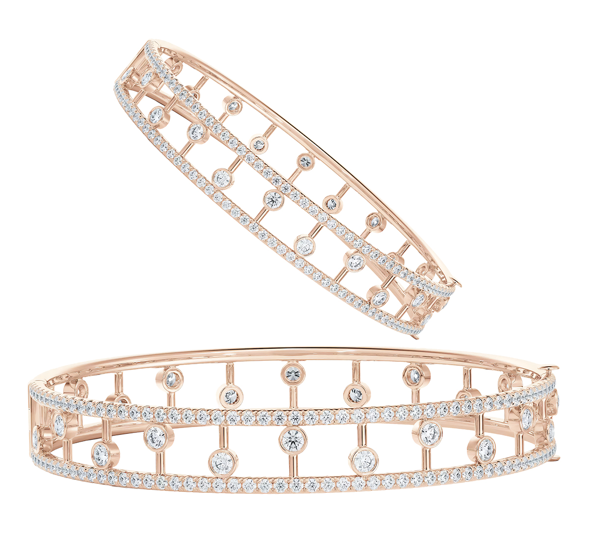 This bangle is dripping with bejewelled stones, from the diamonds crowning the dual frame to those bezel-set in the column-like appendages in between. The 18-karat rose gold finish adds a touch of elegant femininity to the sleek clockwork design.