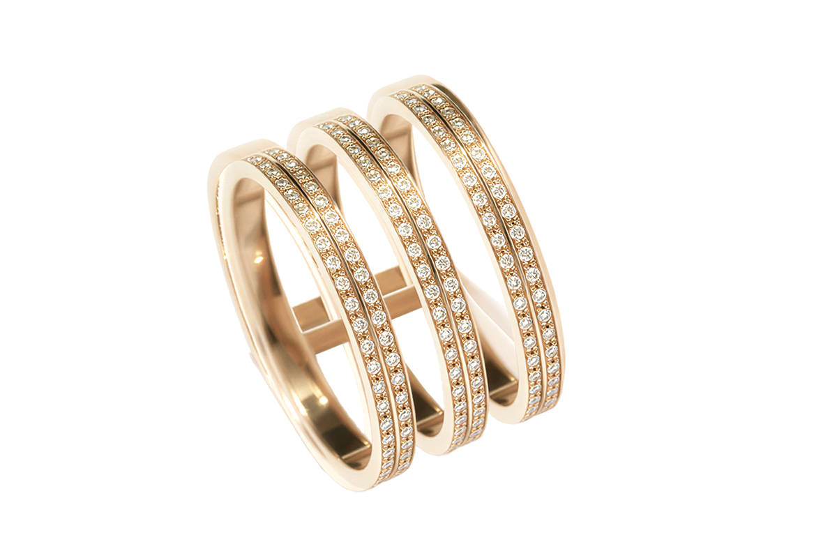 Simplicity goes a long way, and this ring is a perfect example. The design features a stack of three circlets, embodying an austere structurality, while the crystal bedazzling alleviates it from any rigidity, lending a beautiful opulence.