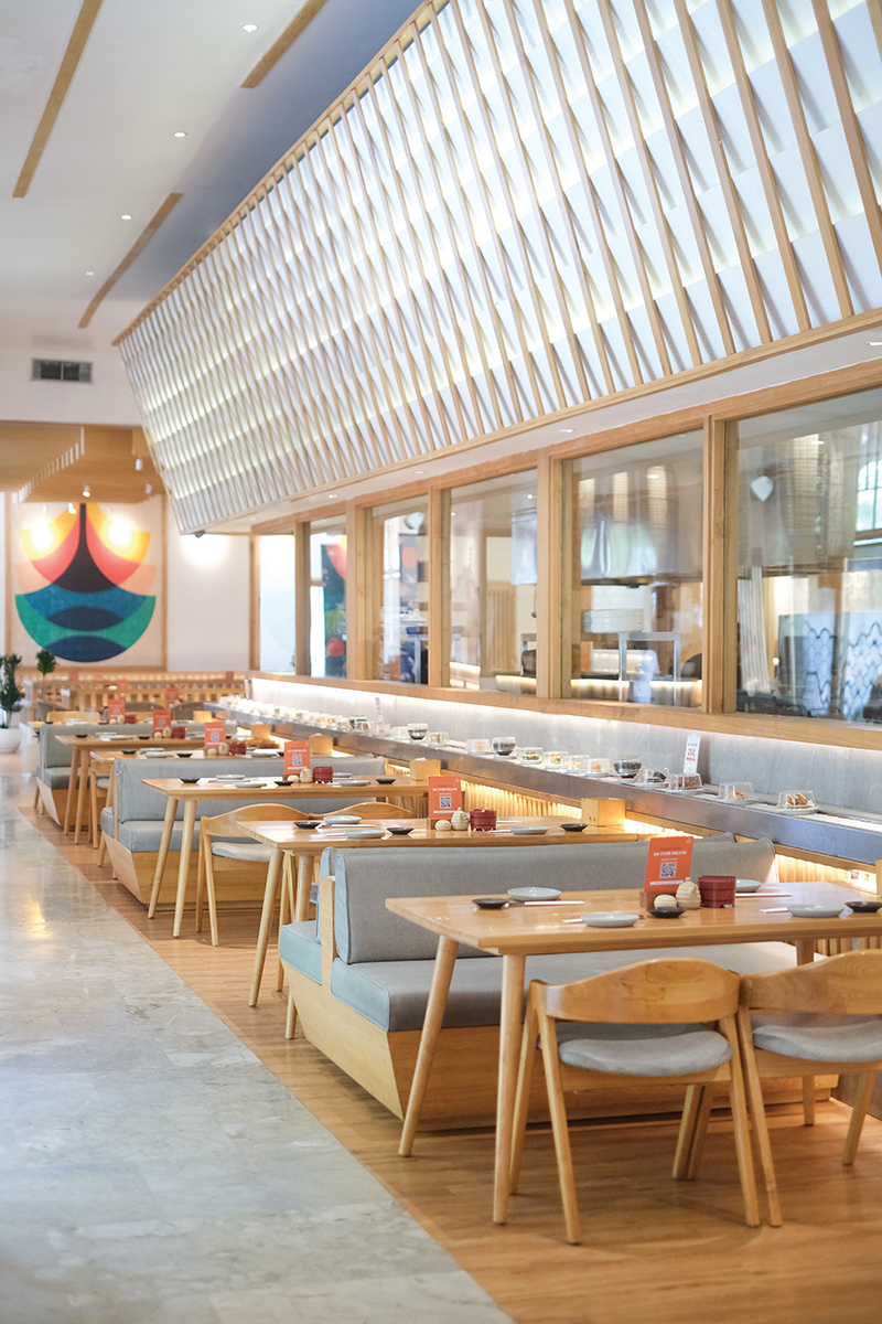 When guests step inside, they are welcomed by a spacious dining area centered around a striking conveyor-belt sushi bar. Plates glide in a steady stream, creating a vibrant scene that showcases the chefs at work. This movement infuses energy into the space while keeping the focus on the food.